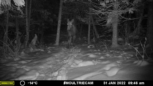 This is actually the second moose I captured on a trail camera this fall-winter. The other was a bull who came by in September, also heading east.